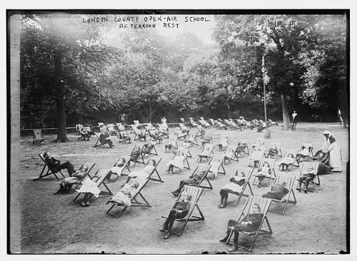 Children in chairs on lawn during afternoon rest,London County Open-air School Review
